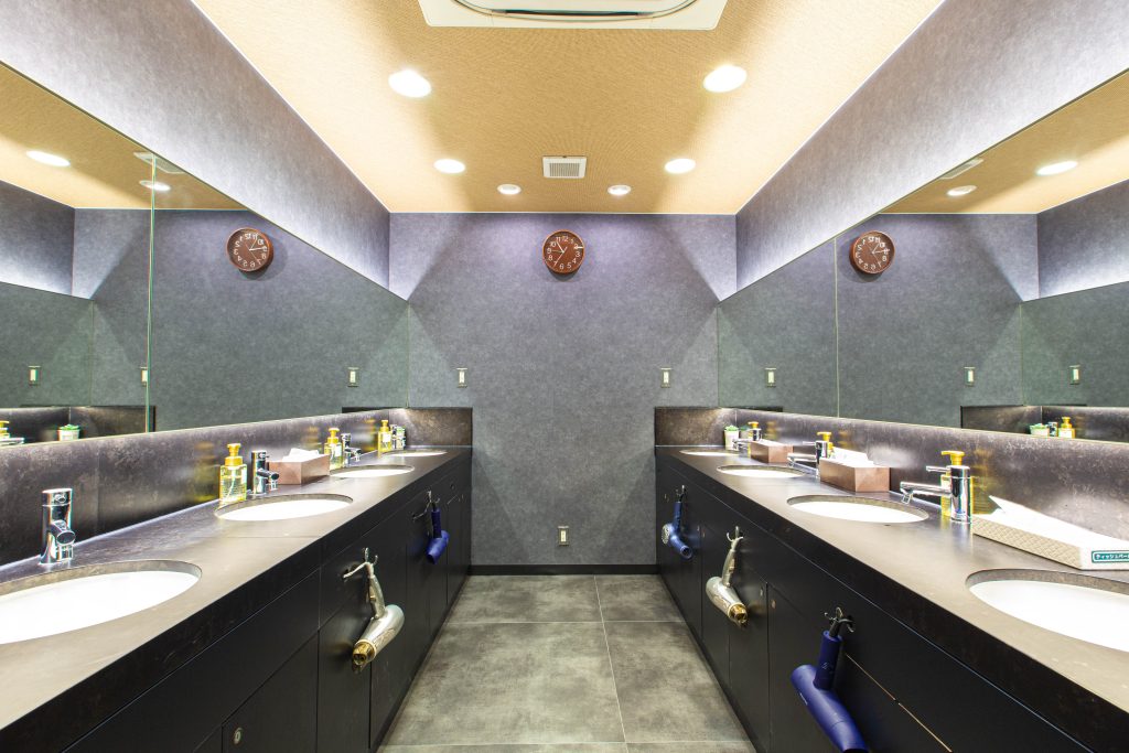 洗面フロアも広くて整髪料も種類豊富で、ヘアアイロンやワックスも完備。